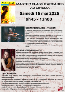 MASTERCLASSES by Violaine DESPEYROUX (viola) and Sébastien SUREL (violin) Calendrier Quand : 16 mai 2026 @ 9 h 30 min – 13 h 00 min 2026-05-16T09:30:00+02:00 2026-05-16T13:00:00+02:00 Où : Cinéma LUX Place de Gaulle 24480 Le Buisson Coût : 10€ Contact : Raymond BARASZ 0687881533 E-mail english Public masterclasses given in the 2 rooms of the Buisson cinema. For accomplished amateur musicians. Pre-registration required: cinemadubuisson@gmail.com Auditors welcome.